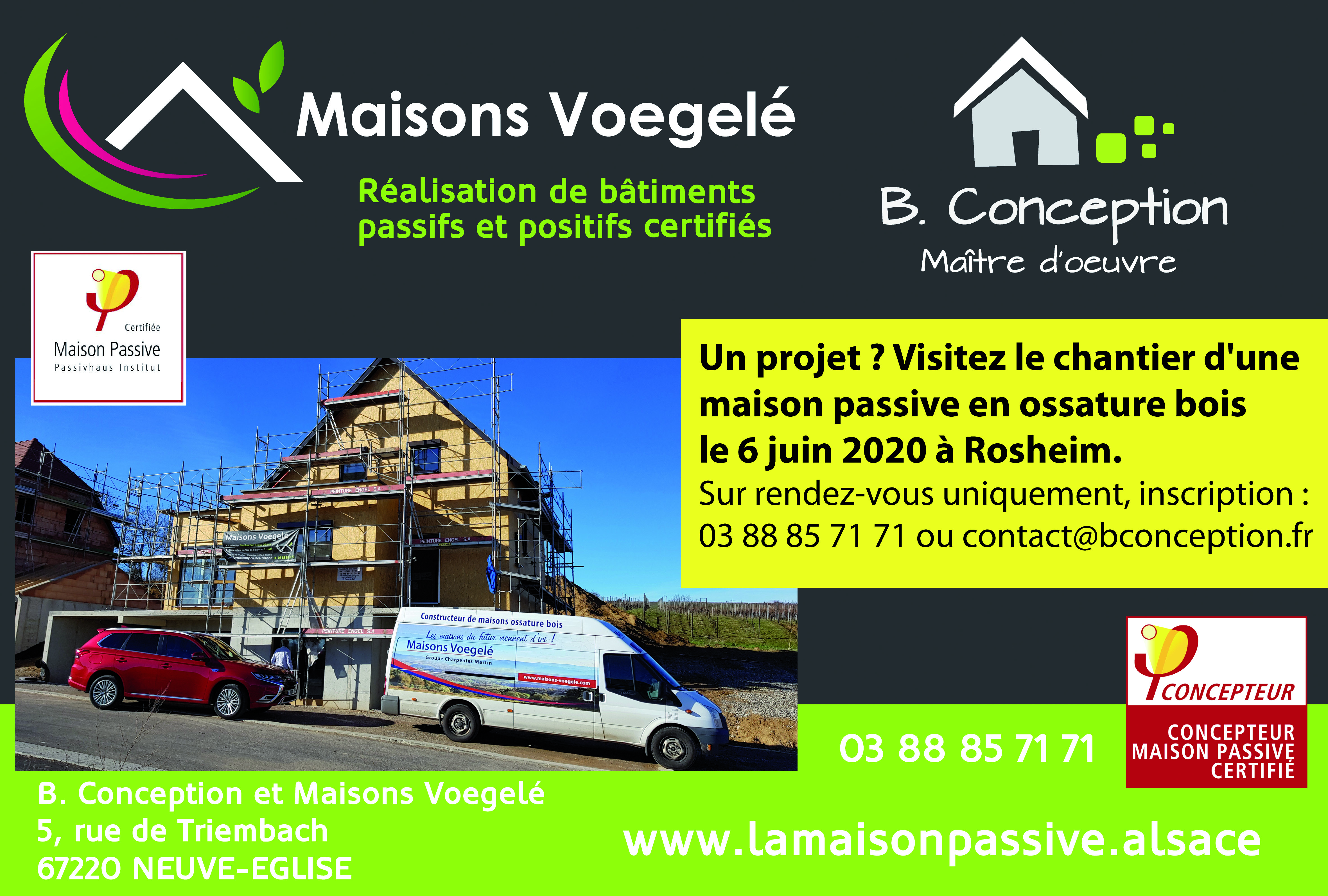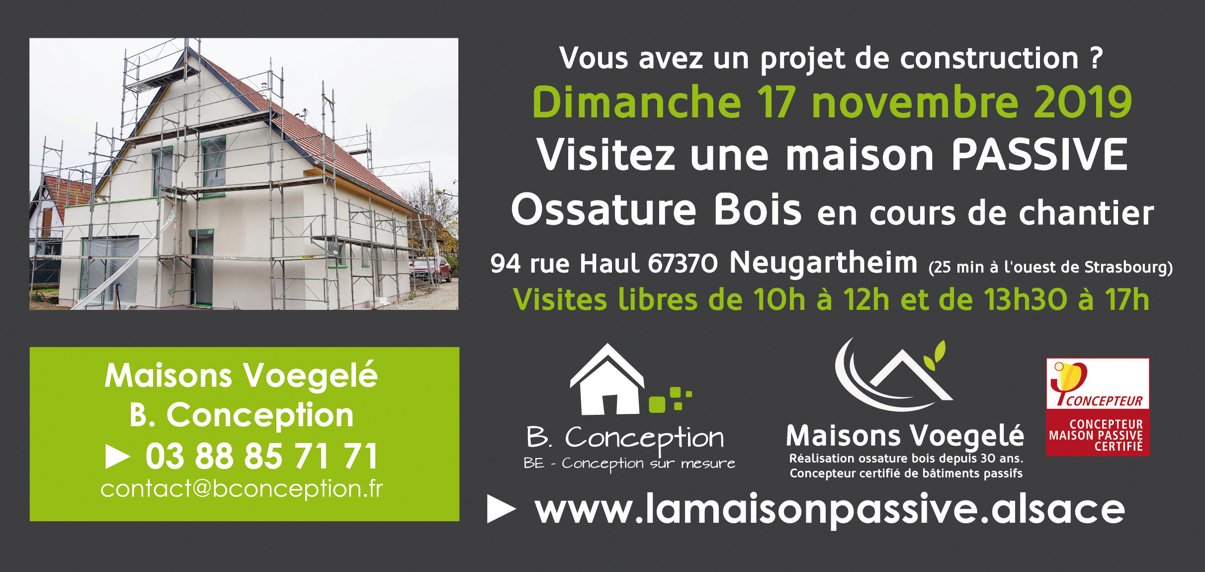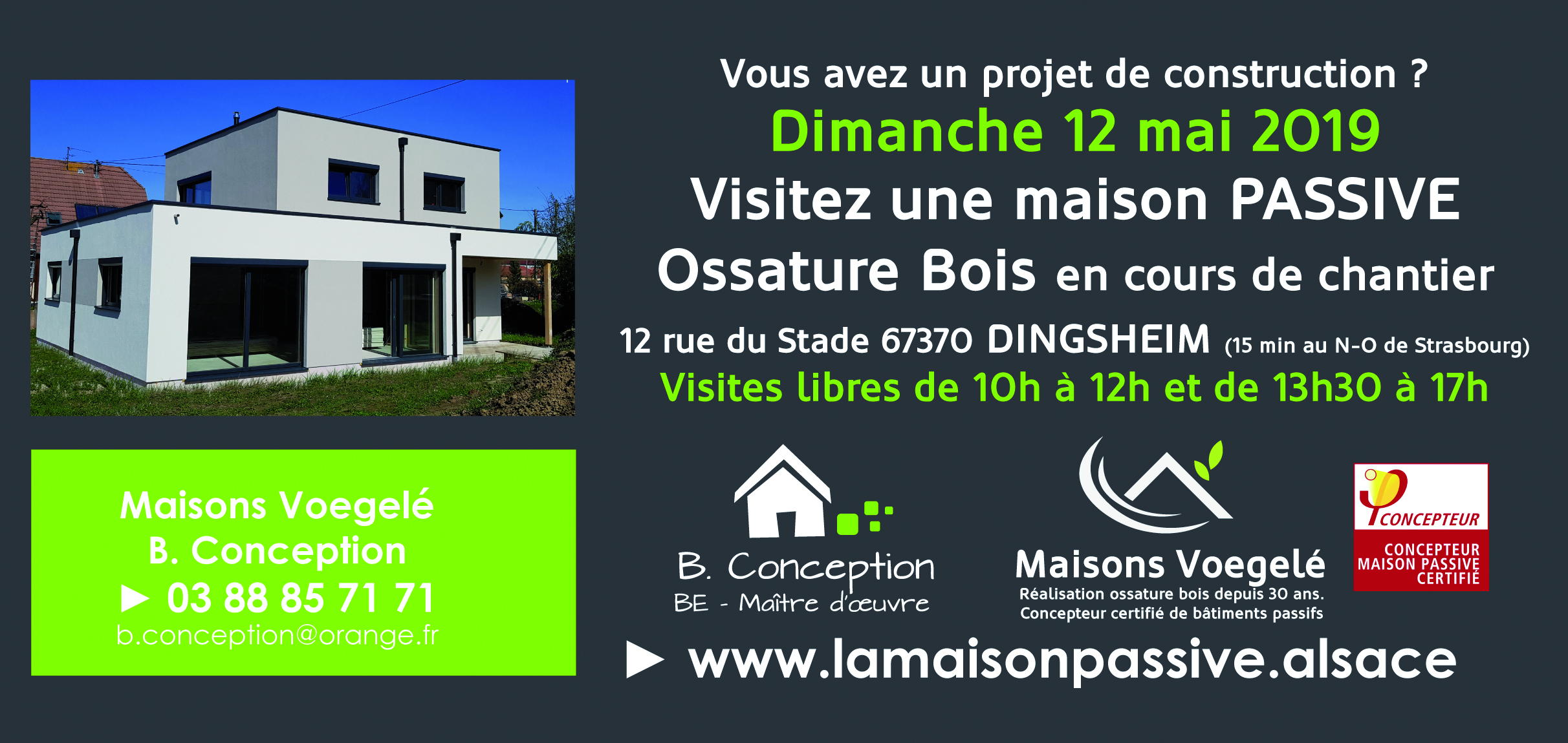 Notre dernier chantier de maison passive touchant à sa fin, nous vous proposons de visiter cette construction située à Eckwersheim, au Nord de Strasbourg le samedi 21 octobre. Visites libres de 10h à 17h. Adresse : rue Albert Schweitzer, face au n°20. Stade chantier : prêt à décrorer. Pour plus d'informations, contactez-nous à b.conception@orange.fr ou au 03 88 85 71 71.