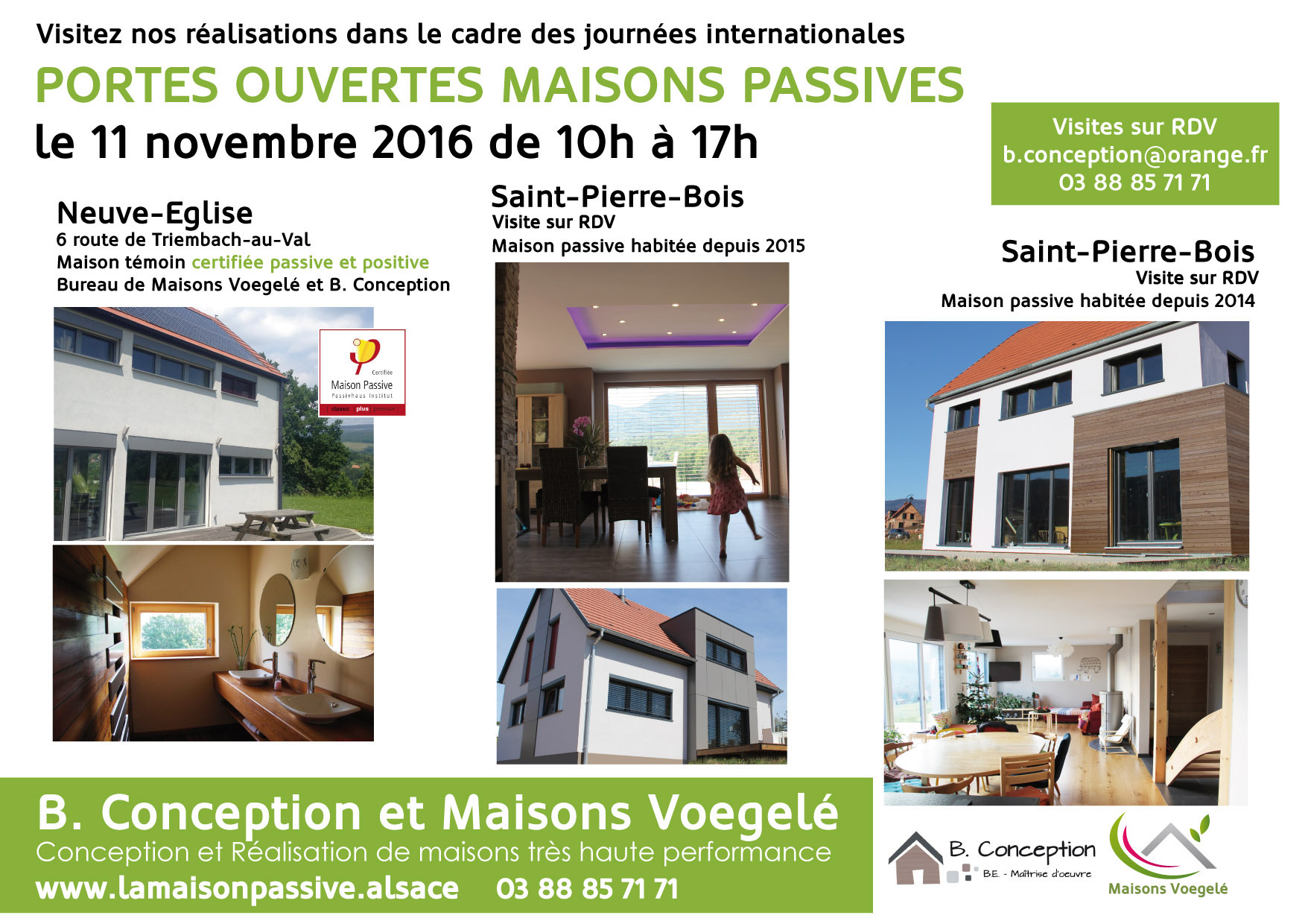 Dans le cadre des journées internationales portes ouvertes des maisons certifiées passives : visitez 3 de nos maisons passives dont notre maison témoin Chloé le 11 novembre 2016 de 10h à 17h , devenue la première maison française certifiée PASSIVE PLUS par le Passivhaus Institut, notamment grâce au rajout de panneaux photovoltaïques produisant 6 kWc ! Retrouvez plus d'informations et les détails de cette transformation positive dans l'article ci-dessous. Visites sur RDV : veuillez nous contacter par mail à b.conception@orange.fr ou par téléphone au 03 88 85 71 71